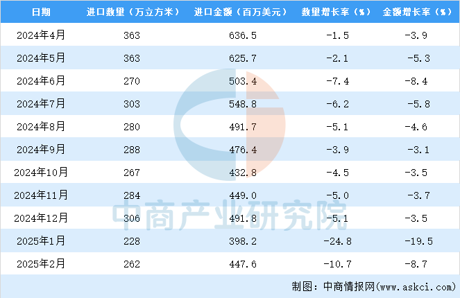 中商谍报网讯:据中商财产研究院数据库显示,2024年中国原木进口量3610万立方米,同比下降5。1%。最新数据显示,2025年1-2月中国原木进口量490万立方米,同比下降10。7%。数据显示,2025年1-2月中国原木进口金额845。9百万美元,同比下降8。7%。更多材料请参考中商财产研究院发布的《中国原木市场前景及投资机遇研究演讲》,同时中商财产研究院还供给财产大数据、行业研究演讲、行业、行业地位证明、“十五五”规划等征询办事。